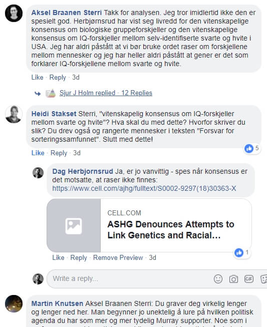 «Herbjørnsrud har vist seg livredd for den vitenskapelige konsensus om biologiske gruppeforskjeller og den vitenskapelige konsensus om IQ-forskjeller mellom selv-identifiserte svarte og hvite i USA.»