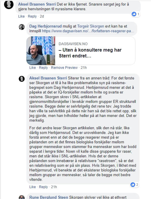 «Det siste utspillet fra Braanen Sterri i Dagsavisen synes imidlertid til fulle å bekrefte inntrykket mange av oss hadde allerede i utgangspunktet, nemlig at hans utilbørlige endringer av Skorgens tekst faktisk handler om å re-introdusere et uvitenskapelig og biologisk ‘rase’-begrep i Store Norske Leksikon.