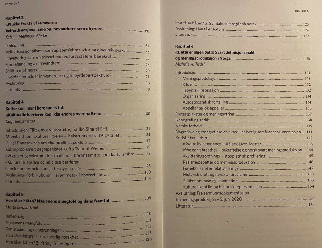 «Et eget kapittel er viet kulturelle barrierer, med interessante eksempler fra corona-pandemien. Kapittelforfatter Herbjørnsrud er sterkt kritisk til nasjonale myndigheters bruk av kulturbegrepet under pandemien og hvordan de dels skjevinformerte om og dels særbehandla innvandrere i sin dialog, sine råd og sine statusbeskrivelser. For eksempel når det gjaldt bruk av munnbind. I følge Herbjørnsrund har det historisk vært et virkemiddel i mange slags pandemier, men under corona ble det plutselig kulturforklart som noe asistisk. Her ble kultur brukt som mur.»