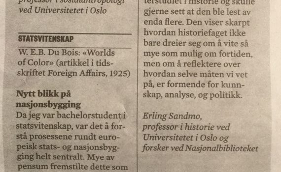 I Morgenbladet 31.08.18 vies debatten om avkolonisering av akademia to sider (s. 4-5) under tittelen «Avkolonisering pågår» (av Ingrid Almlid Åm). Det kommer frem hvordan feks sosiologi på UiO siden 2016 har begynt å inkludere bl.a. Harvard-sosiologen W. E. B. DuBois (1868-1963) på pensum. Mens man på NTNU har en egen «Decolonial Research Group». I en sideramme spør Morgenbladet om hva avkolonisering vil si i praksis. Thomas Hylland Eriksen, Ida […]
